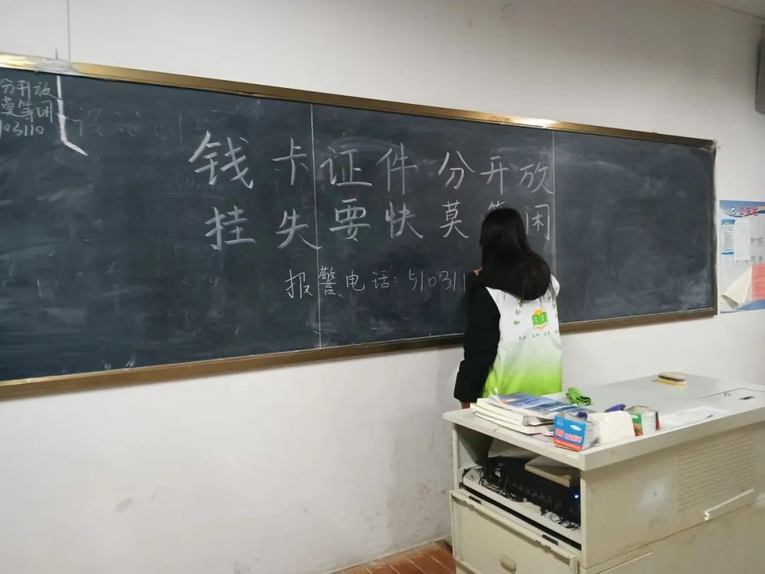 在此次活动中,各班安全委员在黑板上书写“绷紧防范之弦,远离诈骗要害”等有关于防范电信诈骗的标语,并向同学们普及了电信诈骗的报警电话,希望各班级员工牢记报警电话,必要时进行拨打防止财产损失。