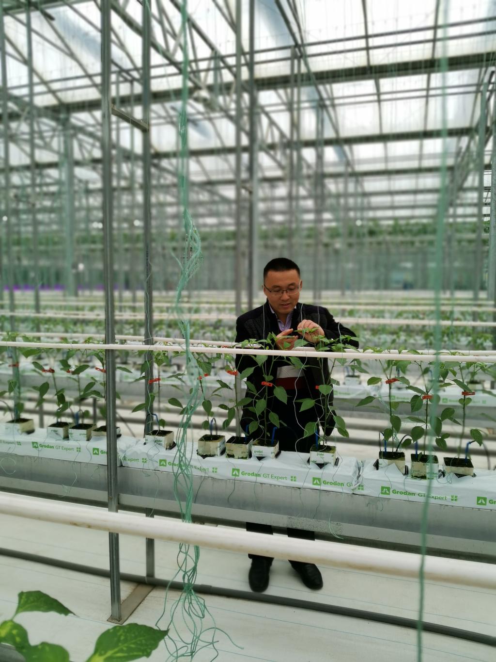图二 孙虎老师正在查看岩棉栽培辣椒的生长情况
