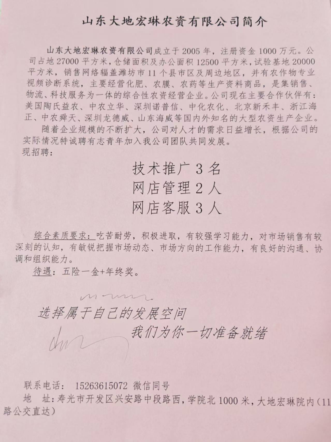 山东大地宏琳农资有限公司深耕农资领域的综合性企业,山东大地宏琳农资有限公司主营化肥、农膜、农药等生产资料,现面向农业相关专业人才招聘3名技术推广岗位,有意者可拨打15263615072了解详情。