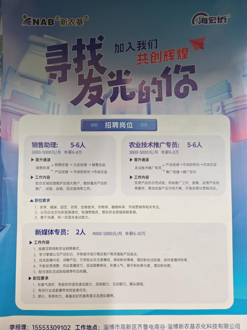 淄博新农基农化科技有限公司是一家专注于植保技术领域的创新型企业,集产品研发、技术创新、渠道销售、植保服务为一体。招聘销售助理(5-6人)农业技术推广专员(5-6人),专业要求农学、植保、园艺、农药、生物技术、作物学、植物科学等相关专业。