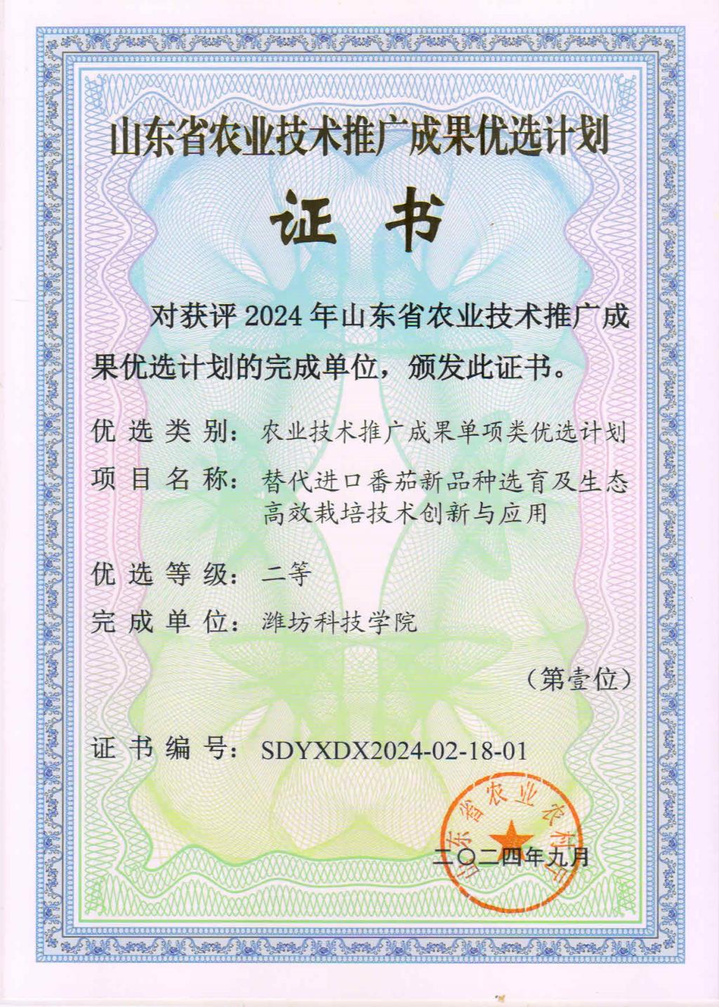 近日,山东省农业农村厅公布了2024年山东省农业技术推广成果优选计划项目(原农林牧渔丰收奖)名单,公司作为第一完成单位,联合山东农业大学、三木种苗、山东省农业技术推广中心等单位申报的‘替代进口番茄新品种选育及生态高效栽培技术创新与应用’项目喜获单项类优选计划二等奖。本奖项充分体现公司近年来开展科技创新、服务农业生产的积极性、创造性,也是太阳集团tyc9728引导产学研推用各方团结协作、联合攻关的代表性成果。